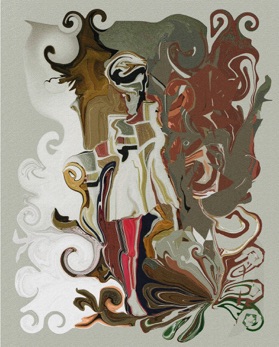 Rödstrumpan som nybakad student med livet framför sig. Över hennes ansiktslösa torso svävar den vita studentmössan som samtidigt är huvudet på mannen bakom henne.